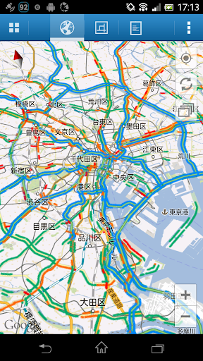 渋滞ナビ独自のクラウド渋滞情報(Beta)をはじめ、(財)日本道路交通情報センター (JARTIC)やGoogle渋滞情報を切り替えながら表示することができます。